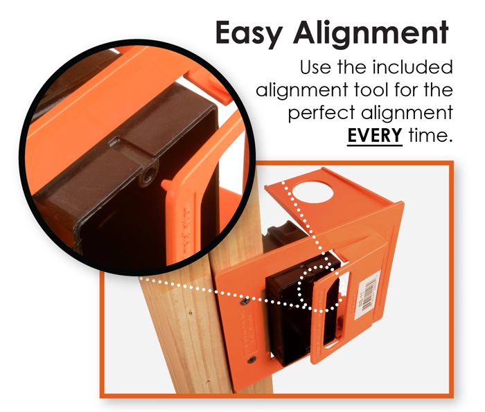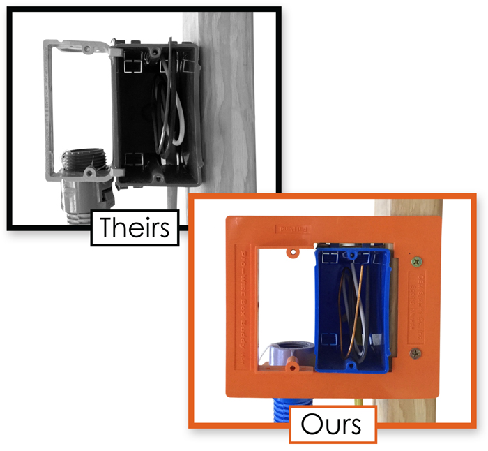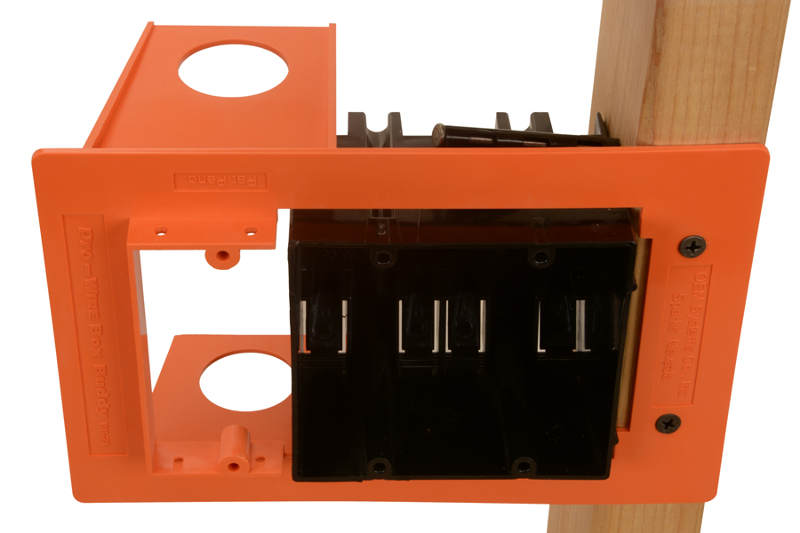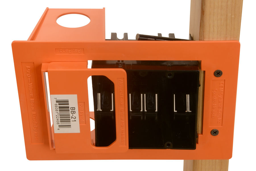 | Box Buddy® low voltage mounting rings are designed for positioning low voltage devices next to 110 VAC electrical boxes with standard NEC spacing so that the combined 110 and low voltage device(s) may be covered with one multi-gang coverplate for an elegant appearance. The Box Buddy® uses a patent pending pull-off alignment tool that makes combined installation and alignment of 110 VAC and low voltage devices simple and quick. Box Buddy® low voltage mounting rings feature conduit flanges off-set by 5/8" which enable unobtrusive use of conduit connectors. |